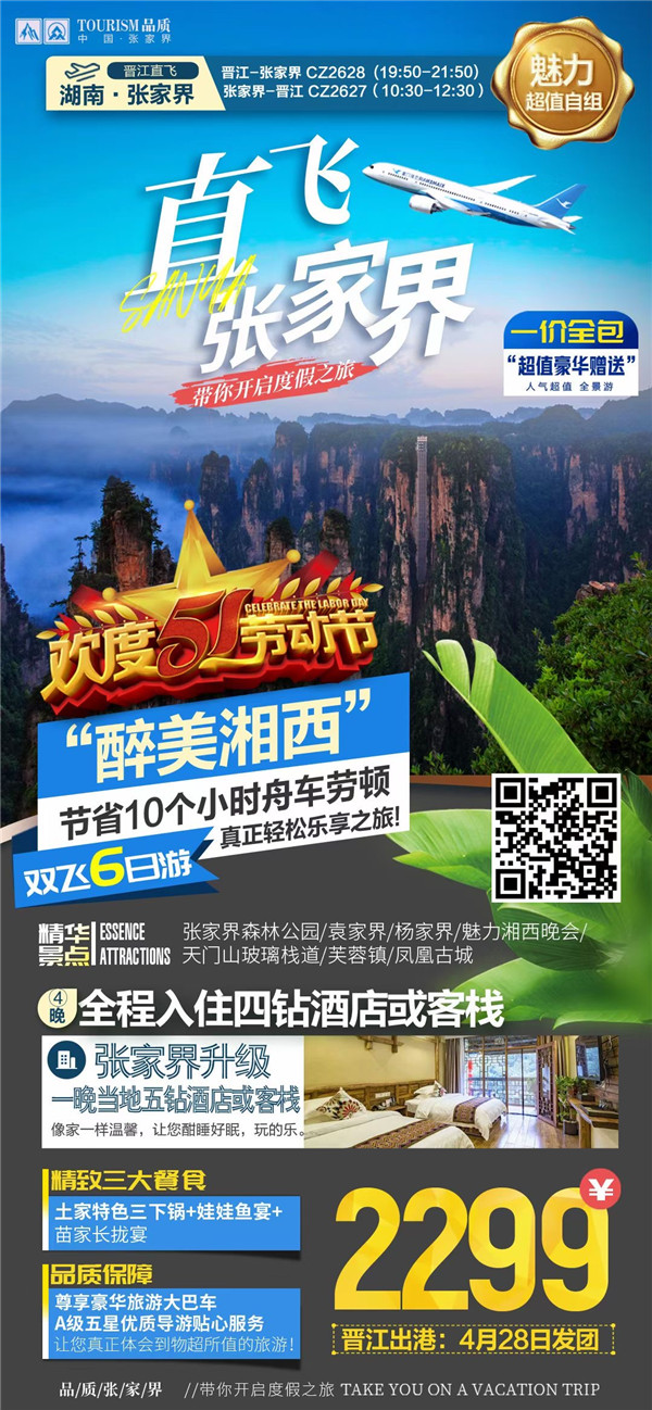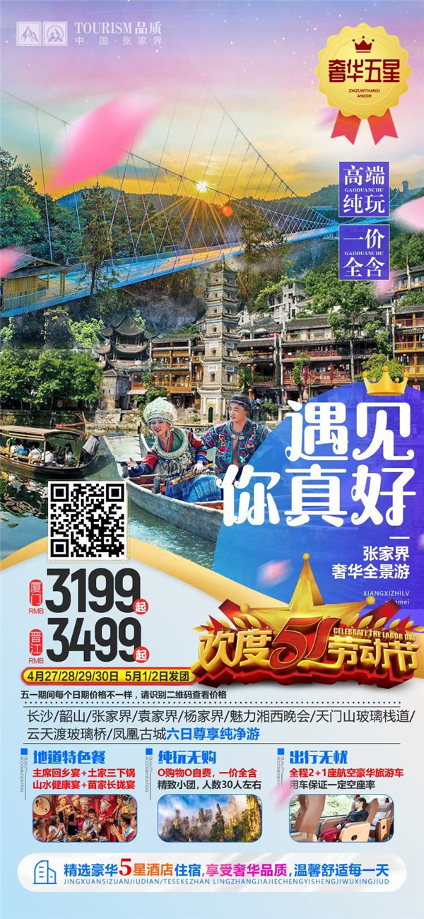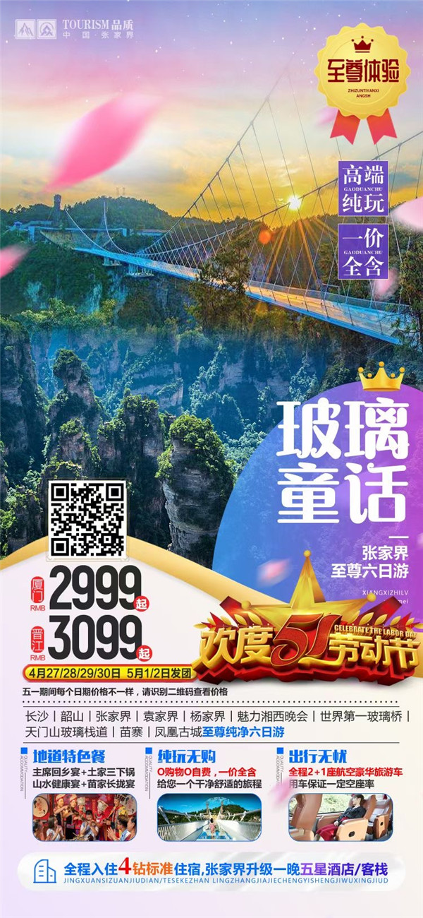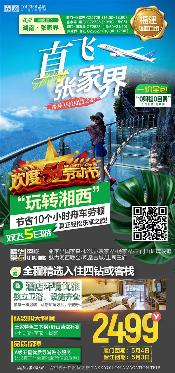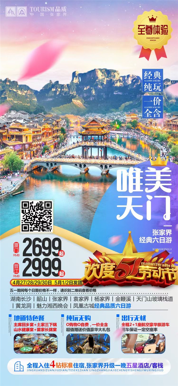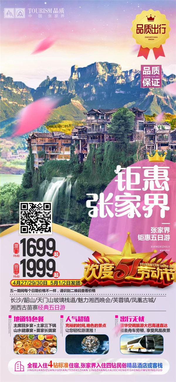本期小编给大家推荐我们公司五一节的张家界线路,大家可以保存图片,微信打开图片识别二维码查看每条线路具体行程安排和费用说明!