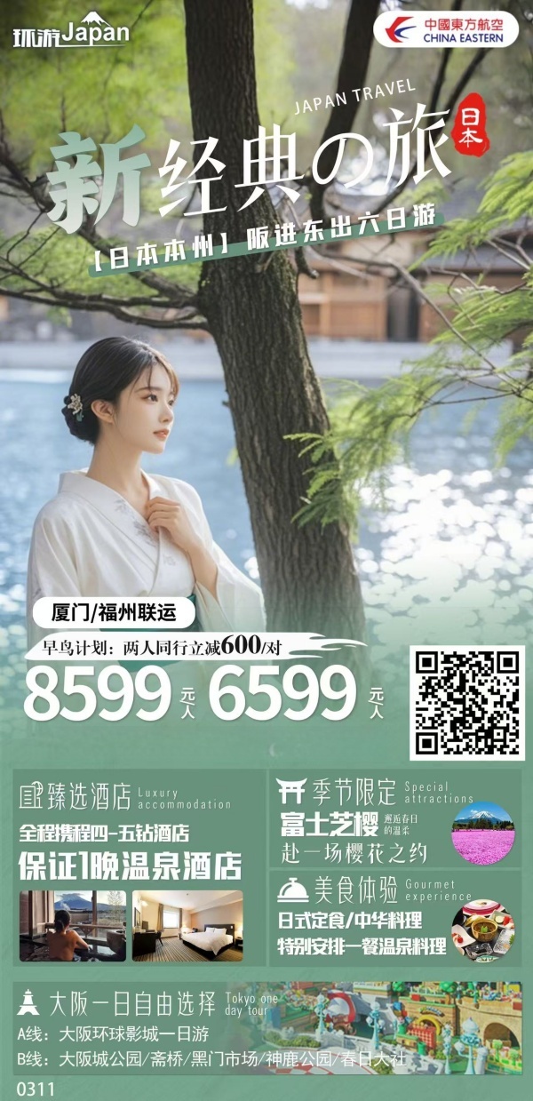 第1天 福建--上海--大阪用餐:早餐()- 午餐()- 晚餐() 住宿:泉佐野中心酒店或同级 于指定时间机场集合,由机场送机人员或领队办理登记手续,搭乘国际航班前往大阪,开启精彩的日本之旅。   第2天 a.大阪环球影城一日 b.大阪城公园-心斋桥-黑门市场-奈良用餐:早餐()- 午餐()- 晚餐() 住宿:京都 S 佩利亚酒店或同级 大阪一日自由时光(可选 A/B,二选一,请于报名时一同确认!)A 线:大阪环球影城(含往返接送,门票以及餐自理)B 线:大阪城公园心斋桥黑门市场奈良神鹿公园春日大社以下为 A 线路介绍:(含往返接送车费,门票、餐自理)【大阪环球影城】位于大阪市的日本环球影城("USJ")是世界 5 个环球影城主题公园之一,在 2001 年开园营业,是诸多游客心中一座经典美好的欢乐世界。它和美国奥兰多的环球影城设计相近,拥有“侏罗纪公园”、““好莱坞”、“水世界”等人气园区,60 多项充满乐趣的游玩设施让你 1 天玩不停,逛不停。日本环球影城还有“超级任天堂(马里奥/超级玛丽)”、“小黄人”和“哈利波特的魔法世界”这些深受人们喜爱的主题 IP 园区。无论是和小黄人趣味互动,亦或是驰骋马里奥赛车大冒险,还是在霍格沃茨穿梭魔法世界,都是精彩纷呈的难忘体验哦。以下为 B 线路介绍:【大阪城公园】(不登城)为日本名将『丰臣秀吉』所造,其雄伟的石墙砌造占地约百万坪,分为本丸、二之丸和城廊之外的三之丸,四周以护城河围绕,四周均为绿意盎然的公园绿地,秀丽的庭园和亭台楼阁、奇花异卉、满目青翠、充满诗情画意。【心斋桥】作为大阪最大的购物区,大型百货店、百年老铺、面向平民的各种小店铺鳞次栉比。集中了许多精品屋和专卖店,从早到晚熙熙攘攘,到处是市民和游客的人流。【黑门市场】黑门市场被称为大阪人的厨房,从江户时代开始经营的传统市场。全长近 600 米,腌菜、海鲜、水果等都可以在这里找到,味道地道,你可以品尝到新鲜的刺身,到了傍晚,这里的生鲜还会全面打折,来这里感受当地人的生活吧。在明治末期以前,黑门市场曾被称作“圆名寺市场”。在这里可以品尝到当地新鲜海鲜和特色小吃。【奈良神鹿公园】奈良公园在占地 660 公顷的辽阔区域内,囊括了由天平时代(710-784 年)延续下来的东大寺、兴福寺以及正仓院等名胜古迹,是一座规模雄伟、绿树成荫的历史公园。最为有名的是春日大社的鹿群,它们被看成是神的使者而受到人们的悉心照顾。另外,以奈良八重樱和九重樱为主,公园内还有约1700 株不同品种的樱花树。尤其是象鹭池、若草山山麓、东塔遗址以及兴福寺一带、荒池、春日野园地、东大寺周边等【春日大社】(外观,不进社参观)是日本本土神道教的宗教参拜场所,距今已有上千年的历史,已经被列入世界文化遗产的名录。春日大社是由强大的藤原家族建立起来的,供奉的是藤原家的四位守护神灵,如今是全日本重要的祭祀场所。相传白鹿是神灵的使者,在春日大社表参道上可以与小鹿同行漫步,沉浸在古木树林包围的大自然中   第3天 清水寺-二三年坂伏见稻荷大社-抹茶体验-平安神宫用餐:早餐()- 午餐()- 晚餐() 住宿:滨松协和酒店或同级 【清水寺】是日本最古老的神社之一,著名的赏枫摄点。这里最大的看点是悬空的清水舞台,站在这里可以眺望京都的古老街道,非常震撼。清水寺中漫山遍野的各色枫叶层层叠叠的美景,有种淋漓尽致的大气。【抹茶体验】日本茶道是在日本一种仪式化的、为客人奉茶之事。原称为“茶汤”。日本茶道和其他东亚茶仪式一样,都是一种以品茶为主而发展出来的特殊文化,但内容和形式则有别。茶道历史可以追溯到 13 世纪。【平安神宫】平安神宫的建筑是模仿平安时代皇宫的部分建筑修建的,不过只有原建筑物三分之二的规模。整座神宫包括大鸟居、神宫道、应天门、大极殿及神苑等部分,有着明显的唐代中国建筑的风格。【伏见稻荷大社】稻荷神是农业与商业的神明,香客前来祭拜求取农作丰收、生意兴隆、交通安全。它是京都地区香火最盛的神社之一。伏见稻荷大社的入口,矗立着由丰臣秀吉于 1589 年捐赠的大鸟居,后面便是神社的主殿及其他建筑物。在神社里,还能见到各式各样的狐狸石像,这是因为狐狸被视为神明稻荷的使者。狐狸脸形的绘马是这里的一个特色。里最出名的要数神社主殿后面密集的朱红色"千本鸟居",是京都最具代表性的景观之一,在电影《艺伎回忆录》中也曾出现过。成百上千座的朱红色鸟居构成了一条通往稻荷山山顶的通道,其间还有几十尊狐狸石像。走进千本鸟居,老朽褪色的暗红色牌坊和光鲜亮丽的朱红色牌坊密集地交织在一起,透过阳光的照射显得格外壮观迷人,视觉上颇为震撼。   第4天 富士山五合目--忍野八海--富士芝樱--天梯小镇用餐:早餐()- 午餐()- 晚餐() 住宿:亚历山大皇家温泉酒店山中湖同级 【富士山五合目】富士山矗立在东京西部,是世界上最大的活火山之一,也是日本的象征。厢根是最理想的