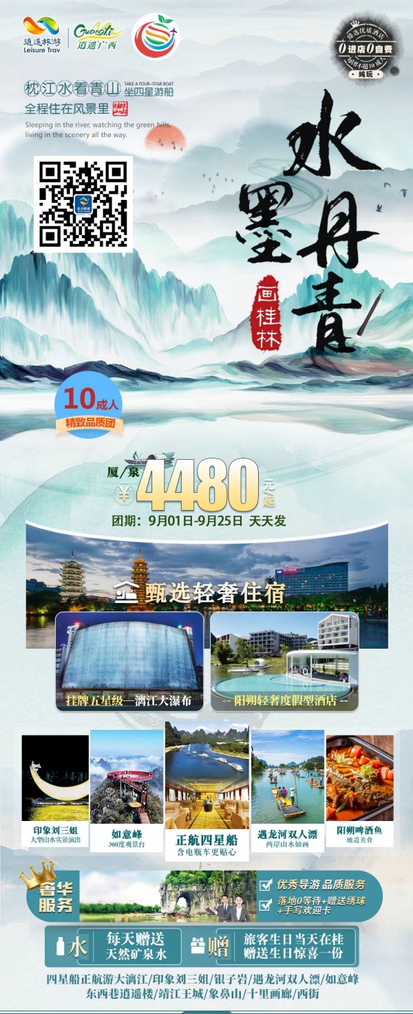 第1天 快乐出发--桂林用餐:早餐()- 午餐()- 晚餐() 住宿:桂林 以山水之名,开启纯玩桂林之旅。 用心迎接您的到来 1、 桂林本地导游会在您到达前一天20点以前与您取得联系,核对信息,请保持通讯畅通; 2、 抵达当天,我们的工作人员会在机场/火车站温馨接待,绣球接机,把代表广西壮族的吉祥绣球在第一时间献给您,热烈欢迎您的到来 (工作人员接到您后,直接安排送您至酒店); 3、 为了您的旅行质量,我司专门建立总经理微信质量管控群,导游会将每天巡餐巡房(询问用餐是否可口、住宿是否舒适)的情况拍照发到群内,由总经理在群内亲自关心您的每天旅行情况。 4、 为欢迎您的到来,入住酒店后,专为您准备欢迎牛奶+手写欢迎贺卡,祝您旅行愉快! ◎ 景点:榕杉湖 可自由漫步【榕杉湖景区】—东方威尼斯,榕杉湖位于桂林城中央,是一个水体相连的连心湖。它以阳桥为界,东为杉湖,西名榕湖,因湖岸生长的榕树,杉树而得名。榕湖与杉湖紧密相连,如同姐妹,日月双塔坐落在杉湖中,日塔为铜塔,月塔为琉璃塔。榕杉湖畔,大树成荫,午后的阳光温柔地撒在行人身上,微风徐徐,将湖畔的花香带到我们的身旁。围着湖畔慢慢行走,微风拂过我们的脸庞,阳光洒在我们的身上,走累了,坐在路旁的凳子上,歇歇脚,岁月静好…… ◎ 景点:东西巷·逍遥楼 也可自由前往【东西巷·逍遥楼】,东西巷是桂林明清时代遗留下的一片历史街巷,空间尺度宜人,是桂林古历史风貌的观景区,包含了正阳街东巷、江南巷、兰井巷等桂林传统街巷,体现了桂林的历史文脉。东西巷以“市井街巷、名人府邸”的特色,体现时代发展的多元文化复合型历史风貌区。桂林逍遥楼,始建于唐初,历代均有重建。即便在坍塌后仅存废墟的年代,仍不断有人前来寻访凭吊,皆因楷体书圣颜真卿题写楼名而名扬天下。缓步行走在这座古楼之中,墙上悬挂的书画,散发着自然芬芳的木制古楼,静静地感受着其中的历史气息,缓步登上二楼,举目望去,只见漓江如带,七星、普陀两峰逶迤起伏,让人忍不住眷恋在历史的古韵中。 ◎ 品尝桂林美食 可在桂林吃货新地标庙街探寻各色美食,桂林卤菜粉,自由加酸辣味,或者来一碗青云汤粉、汤鲜甜美味,也可配点船上糕点,或是品尝来自全国各地的美食。体验桂林人的市井生活,逛吃逛吃……(自由活动时间,司机、导游不陪同)   第2天 桂林--阳朔用餐:早餐()- 午餐()- 晚餐() 住宿:阳朔 景点:四星船游大漓江 早餐后前往被美国CNN评出的15条最值得一去的全球最美河流之一漓江,乘坐四星级游船漫游5A【大漓江风光】(竹江—阳朔,游览时间不少于180分钟)赏漓江有四景:晴景、静景、雨景、雾景,那真是一绝,不管你是什么季节来到这里,都能欣赏到不一样的佳境。百里漓江百里画廊,画卷随着游船顺流而下逐渐展开,在游船上感受唐代诗人韩俞笔下:“江作青罗带,山如碧玉簪”的漓江风光,漓江像蜿蜒的玉带,缠绕在苍翠的奇峰中,景致万千。船经过的地方,奇峰夹岸、碧水萦回、削壁垂河、青山浮水,两岸喀斯特峰林和漓江构成一幅百里的画卷,令人不得不赞叹大自然的鬼斧神工。沿途尽览杨堤飞瀑、浪石烟雨、九马画山、黄布倒影、兴坪佳境等著名特色景观。在CNN评选的《全球最美的十五条河流》中,漓江是我国唯一一条入选的河流,足见漓江之美举世无双。温馨提示:因四星船需提前预订,若遇船票售罄、政府接待或不可抗力因素造成不能乘坐四星船,则调整为三星船游览,按差价退还。因夏季为漓江汛水期及冬季为枯水期,如遇水量不足或涨水等不可抗力因素则调整上船码头,以漓江水运中心具体通知为准。(游船均不予指定上/下舱,随机出票) 贴心安排: 阳朔龙头山码头距停车场约3公里,路途较远,且为了避免走散,已为大家统一安排了电瓶车前往旅游停车场。 ◎ 景点:银子岩 下午前往溶洞奇观——4A【银子岩】(游览时间不少于60分钟)。银子岩溶洞是典型的喀斯特地貌,冬暖夏凉恒温22度,贯穿十二座山峰,以“雄、奇、幽、美”著称。洞内幽幽森森、迂回曲折,汇集了不同地质年代发育生长的钟乳石,闪闪发光,像银子似钻石、晶莹剔透,洁白无瑕,在灯光的照射下,宛如夜空的银河倾斜而下,堪称鬼斧神工,被岩溶专家誉为“世界溶洞奇观”。洞内的钟乳石千姿百态、异彩纷呈,尤以“三宝”佛祖论经、独柱擎天、混元珍珠伞和“三绝”音乐石屏、水镜倒影、银子钻石最具有代表性。整个岩洞犹如珍珠、玛瑙、黄金、钻石镶嵌而成的地下宫殿一般,色彩斑斓、金碧辉煌,因此得来“游了银子岩,一世不缺钱”一说。 ◎ 景点:印象刘三姐 晚餐后鉴赏桂林大型山水实景演出由张艺谋导演——【印象·刘三姐】(演出时间约70分钟,新贵宾B2席),《印象刘三姐》体现了一种淋漓尽致的豪华气派,利用国内最大规模的环境艺术灯光工程及独特的烟雾效果工程,创造出如诗如梦的视觉效果。传统演出是在剧院有限的空间里进行,这场演出则以自然造化为实景舞台,放眼望去,漓江的水,桂林的山,化为中心的舞台,给人宽广的视野和超然的感受。传统的舞台演出,是人的创作,而“山水实景演出”是人与上帝共同的创作。在印象·刘三姐,山峰的隐现、水镜的倒影、烟雨的点缀、竹林的轻吟、月光的披洒随时都会进入演出,成为美妙的插曲。座位为观赏角度最佳、整个观众席最中间位置—贵宾席B2票。(温馨提示: