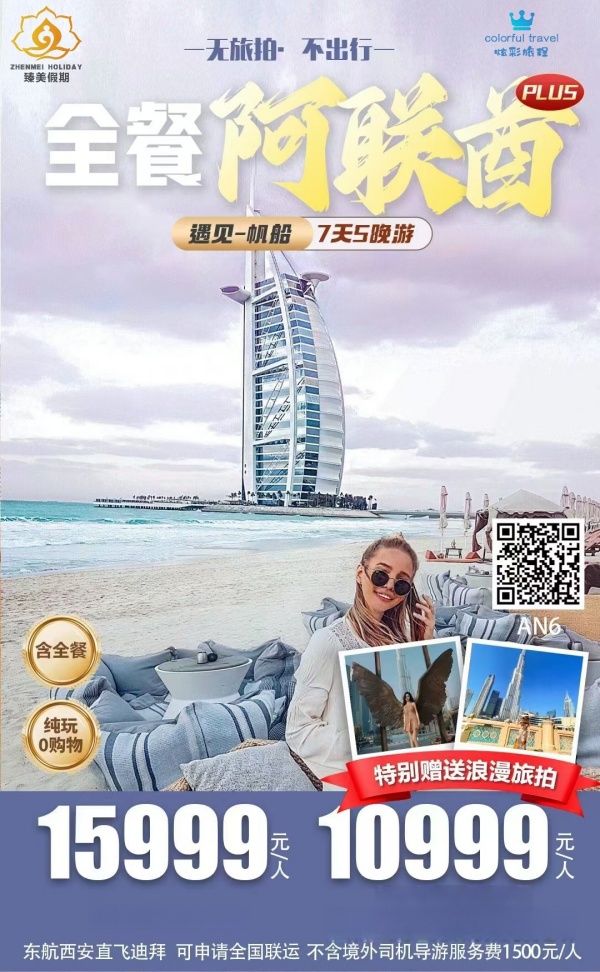 报名所需资料: 至少6个月以上有效的因私护照首页扫描件。 报名后,退改团期损失条款: 1、以收到定金5000元/人为确认参团留位,如有升级豪华酒店(帆船、亚特、皇宫等)将视豪华酒店价格收取部分定金或全款。如取消定金不退,并于出发前14天付清全款。 2、团队出发前30天—21天取消,游客需支付50%团款损失(机位定金+酒店损失)。 3、团队出发前20天—14天取消,游客需支付80%团款损失(机位定金+酒店损失+地接车、导、境外机票等费用)。 4、团队出发前14天—8天取消,只可退200元/人餐费和景点门票。 5、团队出发7天内取消,全款损失。 未成年人参团提示: a)因服务能力所限,无法接待18周岁以下旅游者单独报名出游,敬请谅解。 b)阿拉伯联合酋长国(阿联酋)政府向所有航空公司发出告示,要求所有前往阿联酋的未成年旅客(未满18岁的儿童)证件的检查,受新政策监管,并将於2018年6月1日生效。请带齐相关证件出团。 c)未成年人参团必须由家属陪同。另外18岁以下儿童出游,必须带齐户口本,出生证,委托书等证件,以备在办理登机时航空公司检查。 d)因接待情况所限,小孩根据实际标准收费。 老年人参团提示: A)因服务能力所限,无法接待80周岁以上的旅游者报名出游,敬请谅解。 B)70周岁以上老年人预订出游,须与我司签订《健康证明》并有家属或朋友陪同方可出游。 贵宾参团须知: 1、请各位旅客出发之前与领队确认护照是否已在领队手中,若护照在自己手中的,请务必出发当天带好护照。 2、如遇旅客是外籍护照,请务必检查护照上中国签证有效期是否足以保证回国后可以入境中国大陆。 3、如旅客为港澳护照或台湾护照,请出发当天务必带好回乡证或台胞证。 4、行程中因个人原因临时自愿放弃游览,景点门票费用、酒店住宿费用、餐费、车费等均不退还。 5、行程表中所列航班的起抵时间均为当地时间,“+1”表示航班第二天抵达;行程表中所列餐食,“X”表示该餐食不包含在行程中。 6、保险说明:强烈建议客人自行购买“游客人身意外保险”,如旅行社出资为游客投保,如客人发生意外伤害事件,视事实情况保险公司对此承担相应的法律责任,游客获得保险公司理赔金额后,相应免除旅行社的赔付责任。“游客人身意外保险”的适用范围以及条件以“中国人民财产保险股份有限公司境外旅行意外伤害保险条款”为原则。 7免签是目的国移民局即时给予的入境许可,非旅行社能力可掌控和干预,请自行准备好完整无污迹的有效护照,如由客人自身情况(不良记录、姓名易重名等因素)落地入境时出现被拒绝入境,而导致的一切相应损失(我社代订的机票、酒店及相关已产生的费用一律不退)需客人自行承担,和我社毫无关系,敬请谅解。 8、根据《旅游法》规定,旅行者不得脱团,如走行程中擅自脱团、离团、滞留等,旅行社将向公安机关、旅游主管部门、我国驻外机构报告,由此产生的一切法律后果由旅游者承担。 9、请游客在境外务必注意人身及财产安全,不要前往不安全的地方,自由活动不要单独行动。老人、儿童需有家人陪伴及照顾。 10、酒店游泳池如时间未开放及无救生人员在现场,请勿擅自入内泳池游玩,否则如有意外发生须自行负责。 11、所有参团客人必须根据自身身体实际情况选择参与自费项目,对客人未能遵守风险告知事项,未能采取积极主动措施防范风险发生,所造成的损害,由客人自行承担一切责任。 1.以上行程时间表及酒店的住宿顺序仅供您参考,有可能会因为境外特殊情况予以前后调整,如遇堵车、恶劣天气、景点关门、展会、突发事件及酒店满员等!2.同一团队不同客人可能入住不同的酒店,境外将根据酒店顺序依次接送入住不同酒店,敬请知晓!3.至少 6 个月以上有效期的因私护照首页扫描件(至少 3 页以上空白页);4.中国大陆护照及香港、澳门护照入境阿联酋实行免签政策、成人需提供护照首页资料扫描件,未满 18 周岁除了提供护照首页扫描件,还需要提供出生证明+父母护照或身份证扫描件出行。以上参团资料仅限中国大陆护照,非中国大陆护照参团资料请以阿联酋移民局规定为准