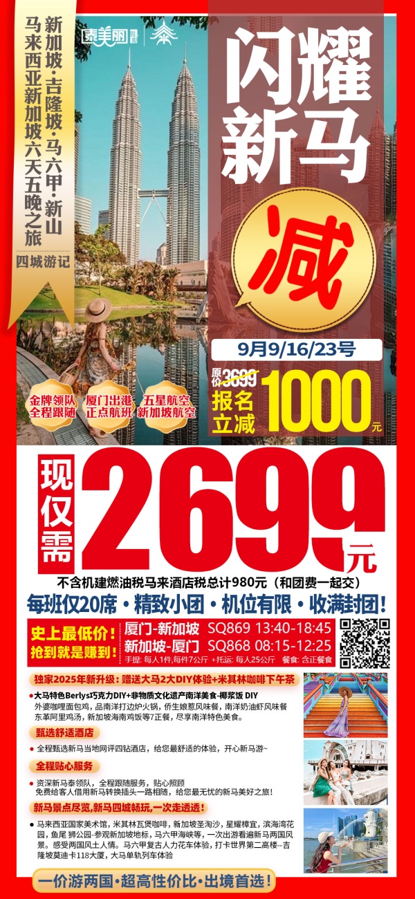 第1天 泉州-新加坡用餐:早餐()- 午餐()- 晚餐() 住宿:新加坡当地四钻酒店 乘机前往新加坡:新加坡是亚洲的发达国家,被誉为“亚洲四小龙”之一,其经济模式被称作为“国家资本主义”。根据 2014 年的全球金融中心指数(GFCI)排名报告,新加坡是继纽约、伦敦之后的第三大国际金融中心,也是亚洲重要的服务和航运中心之一。今日的新加坡繁华美丽, 您或许不知道,这个国际大都市昔日只是一个不起眼的小渔村。在这个高楼林立、绿意葱笼的国际大都会里,您可以游览富有文化特色的主题旅游区,看看东西方元素如何巧妙地融合在本地文化、美食、艺术与建筑中,散发多姿多彩的非凡活力。抵达机场后,前往:新加坡网红地点之-星耀樟宜(外观拍照 10 分钟)新加坡的樟宜机场,它连续六年被评为“世界最佳机场”,里面除了繁忙的交通枢纽外,意外惊喜简直多到数不过来~星耀樟宜位于整个机场的核心位置,其内部一共有 5 层楼,占地 1.4 万平方米,堪比 11 个奥运会标准大小的游泳池。从外观上看,就好像一个巨型玻璃甜甜圈一样,看起来科技感十足,非常引人注目!网红“雨漩涡”-“星耀樟宜”最大的亮点,就是在人流聚集的中央位置,设计了一个高达 40 米的雨旋涡。它将会是世界上最高的室内瀑布,置身其中,游客们就能感受到白练垂空、银珠飞溅的壮观场景,仿佛来到了大自然,给人带来无比强烈的视觉震撼。共同营造亲切自然的氛围。这些植物全都来自于世界各地,为樟宜机场带来一丝浓郁的自然气息。四周掩映的是田园诗歌般的园林景观资生堂森林谷。约 120 种树木和植物在此栖居,布满四周将近五层楼的墙面,这些植物在净化空气的同时,也能起到很好的装饰效果,给游客一种走进原始森林的即视感。入住酒店之后客人自由活动。   第2天 新加坡--新加坡市区风光之旅--新山用餐:早餐()- 午餐()- 晚餐() 住宿:新山网评四钻酒店 早餐后进行英国风情之旅(游览约 1 小时)—伊丽莎白公园(参观新加坡第一只鱼尾狮雕像)位于新加坡河畔,是新加坡的标志和象征。鱼尾狮像坐落于市内新加坡河畔鱼尾狮公园内,是新加坡的标志和象征。每年来自全球一百多万的游客都会专程造访鱼尾狮公园,与世界著名的鱼尾狮拍照留念。鱼身象征着新加坡从小渔村谦卑起步,狮头则代表了新加坡最早期的名称 “Singapura”,马来语中意指“狮城”。如今,您可以在鱼尾狮公园一睹这座传奇雕像的风采。鱼尾狮雕像高达 8.6 米,重达 70 吨,口中源源不绝地喷出水柱,汇入新加坡河中,鱼尾狮雕像已成了到访新加坡的必看景点!公园周围还聚集了很多新加坡著名的地标性建筑。高等法院(外观)、国会大厦(外观)、市政厅、维多利亚剧院、圣安德教堂(外观)、榴莲形大剧院(外观)、莱佛士铜像等,选购伴手礼(珠宝店+百货药油店)前往新加坡的第一山【花芭山】(约 30 分钟左右),这里是观赏新加坡城市全景最佳的地方,眺望海景和全岛风貌,一览世界级货运量转载的货柜深水码头【新加坡最美天际线---滨海湾花园】(底下参观外观约 30 分钟左右):位于滨海湾之畔,郁郁葱葱、风景秀丽的滨海湾花园由几个精雕细琢的生态馆构成,尽显建筑、设计和工程领域的奇观。这座占地 101 公顷的超级花园以10 亿元造价成为新加坡最新的地标,游客可在花园中巨大的半球形温室里观赏到超过 25 万棵奇花异草,和全球最大的室内瀑布。花园设计带有很强的科技感,园内的 18 棵擎天巨树,树冠部分安装了光伏电池,白天能够吸收太阳光能供夜间照明。花穹和云雾林是滨海湾花园内的两大冷室,2015 年被吉尼斯世界纪录列为全球最大的玻璃温室。千万不要错过别具一格的擎天大树,这座 25 至 50 米高的垂直花园,不仅可以收集雨水,产生太阳能,还是花穹和云雾林的通风管道。接着驱车前往新加坡绿色岛屿;现有最新落成的【新加坡南部绿色岛屿】(约 60 分钟):作为亚洲顶级一站式综合娱乐城和独一无二的家庭度假胜地,名胜世界集吃喝玩购物住宿于一身,让时尚年轻一族、全家大小、企业会奖都可于此欢度悠闲假期。现开放有新加坡环球影城、节庆大道;梦之湖和各式酒店,游客可自由闲逛节庆大道、娱乐城等免税商场。【心之音】心之音位于占地 3 万平方米,在此漫步的人都能乐在其中,为岛上原生态的美景所深深折服。这个令人着迷的打卡地拥有一系列感官庭院,其中包括一条长达 350 米的自然景观通道。这些庭院融合了自然、建筑和科技元素,激发并唤醒了游客的想象力等六种感官。作为一条供休憩和探秘的通道,心之音还蕴含了几座感官庭院:观径、触阁、馨境、韵源、津庭和光苑。每一个庭院都为所有游客提供了身临其境的视听体验,激励并愉悦人心。心之音突破了传统公园设计的界限,将令人称奇的建筑与自然美景融为一体。这个独特的空间不仅让游客沉浸在迷人的数字灯光艺术中,还能体验增强现实带来的迷人昼夜之旅。游客可以在这片宁静的环境中放慢脚步,放松身心,重新发现自我。从新加坡乘车前往新山入住酒店。新山享用晚餐。用餐: 早餐:有;午餐:新加坡娘惹菜;晚餐:马来风味特色餐   第3天 新山-马六甲风情之旅-吉隆坡用餐:早餐()- 午餐()- 晚餐() 住宿:吉隆坡网评四钻 早餐后前往华人聚居古城—马六甲(车程约 2-3 小时)。经新柔佛长堤抵达马来西亚的历史古城【马六甲】,马六甲建于1403年,曾是满