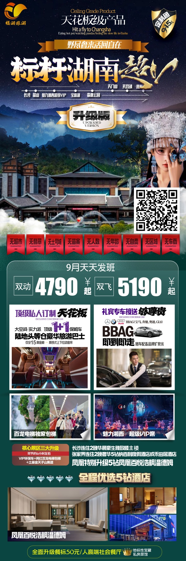 远眺天子山全景。·自然物造:赠送核心景区无人机全景视频航拍大片,来一场人与景的完美结合·宝藏私房菜馆:大山里的好食材 湘西民间特色菜--《二当家》·温馨提示:1、核心景区VIP环保车优先通行+百龙电梯包梯免排队专梯服务为体验赠送项目,如遇政府管控不接受投诉及等价交换,敬请理解2、景区内为野生猕猴栖息地,不招惹猴群,以防抓伤。张家界为山岳型景区,为方便在山区游览,请穿平跟鞋,建议不穿裙子、太阳帽、防蚊水等物品。3、山顶无优质餐厅,建议自备干粮或享用  第4天 天门山-芙蓉镇-凤凰古城《湘见沱江》用餐:早餐()- 午餐()- 晚餐() 住宿:凤凰古城 两晚连住继续享受自然醒的早晨一早餐后8:00分统一大厅集合出发,然后前往游览“武陵之魂”湘西神山【天门山】:乘高山客运索道上山:游览碧野瑶台、觅仙奇境、天门洞开景区,体验“云在脚下,奇峰尽览,万象目中”的豪迈感觉。观五大奇观,【天门索道】:索道线路斜长7455米,上、下站水平高差1279米,是世界最长的单线循环脱挂抱索器车厢式索道。【玻璃栈道】这条看着就让人腿软的玻璃栈道给人带来的刺激震撼感。【通天大道】:被称为通天大道的盘山公路共计99弯,“天下第一公路奇观”横空出世,垂直高差达千米左右。【天门洞开】是罕见的高海拔穿山溶洞,上天梯登临天门洞共有999级台阶,象征着至高无上和天长地久,已成为八方来客朝圣天门的登天祈福之路。【鬼谷栈道】:栈道全长1600米,平均海拔为1400米,全线立于万丈悬崖的中间,给人以与悬崖共起伏同屈伸的感觉。 前往挂在瀑布之上的千年古镇--【芙蓉镇】:(约108KM、车程约2小时)古色古香的吊脚楼、数百年遗留下来的石板小街王村瀑布、可以品尝到刘晓庆主演《芙蓉镇》剧中米豆腐店中的米豆腐。 然后赴曾被新西兰著名作家路易艾黎称赞为中国最美丽的小城一【凤凰古城】(118KM、车程约2小时、接驳车直达酒店)然后夜游《湘见沱江.七重水幕灯光秀》(赠送项目,如停演将取消不做等价交换):坐上乌篷船,听着船公的号子,看着两岸已有百年历史的土家吊脚楼,别有一番韵味.然后可欣赏沱江美丽的夜景,可自行漫步沱江 ,燃放许愿灯,或约上三五好友前往沱江边上酒吧畅饮当地胡子酒,品味独特的苗疆风,请,一切烦恼都会随风而去宝藏私房菜馆:食鲜味美养生之王-《景上禾原生态餐厅》