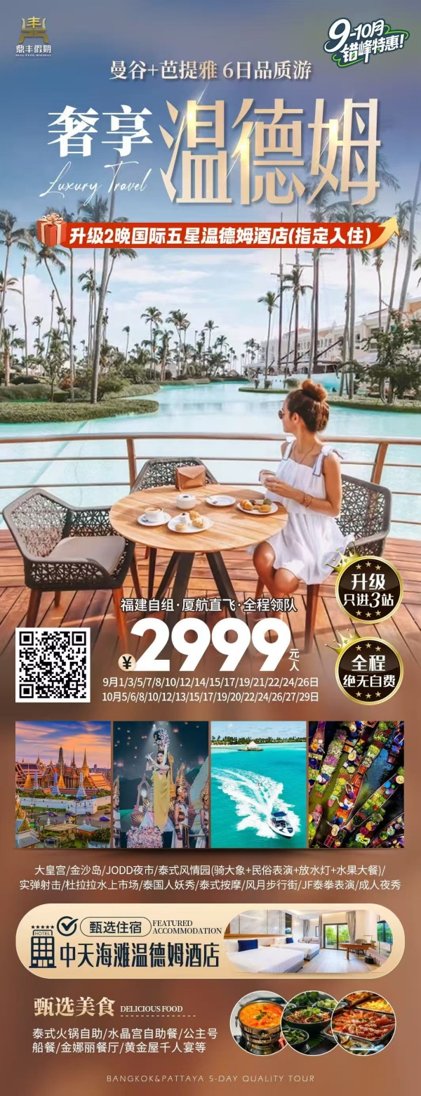 第1天 厦门/泉州-曼谷-JODD 夜市用餐:早餐()- 午餐()- 晚餐() 住宿:曼谷 贵宾们于指定时间地点集合搭乘国际客机,飞往泰国浪漫首都-曼谷,步出曼谷机场,空气中的燥热夹 杂着些许的轻松畅快,这就是东方威尼斯~微笑之国~1782 年正式成为泰国首都,总面积 15687 平方公里的~ 曼谷。导游以在接机大堂等候多时,晚上前往曼谷最新网红【JODD 夜市】(自由活动时间不少于 90 分钟) 集合美食购物旅游酒吧于一体的超大夜市,一半是饕餮 的泰式美食及热闹酒吧,一半是可尽享淘货乐趣的 实用商品、手信。因位于市中心,交通便捷,是不可错过的一个特色景点和体验特色集市的好去处。游客请您携带真实有效的护照原件(有效期 6 个月以上、有足够空白页)泰国海关规定:进入泰国的每位必须最少携带 4000 元人民币(可以人民币加泰铢一起等值那么多现金也可以)否则有可能被移民局误认为打工者,将无法进入泰国   第2天 曼谷-大皇宫-玉佛寺-船游湄南河-泰式按摩---人妖歌舞秀用餐:早餐()- 午餐()- 晚餐() 住宿:曼谷 早餐后前往参观曼谷的标志【大皇宫】。由白色的宫墙围绕着,占地约一平方英里,建于公元 1782 年的大皇宫,由拉玛一世所建,包含了数栋建筑物,雕梁画栋,美不胜收。皇宫内尽是华丽壮观的建筑物, 在阳光的照射下,呈现出耀眼金黄色,非常漂亮!【玉佛寺】在皇宫内,寺内安置着一尊绿色玉佛,正殿大 厅便供奉着这尊著名玉佛,是拉玛一世时期所建,这里的建筑宏伟庄严,入门即可见到许多佛殿及闪烁的宝 塔,寺内走廊四周以印度古典文学为题材的彩色连环漫画,共178幅,工程非常浩大,呈现出的画面令人感动!【船游湄南河】让您亲身体验到泰族母亲河无穷的魅力。【郑皇庙】远眺,又称黎明寺,是纪念泰国第 41 代君王,民族英雄郑昭的寺庙,参观郑王庙可了解泰中两国的亲缘关系和深厚友谊。现存塔高 75 米,高耸入云,周围由小塔簇拥,雄伟壮观,塔建造在一连吕的平台上面,台基雕刻着动物和众神像,刻工精美,塔身镶满了从中国进口的彩色磁砖和玻璃珠,塔尖用金箔包裹,整座塔群显得金碧辉煌。【泰式按摩】(60 分钟,技师小费自理),通过技师娴熟的指压技法,让您舒筋活络,通体舒畅。后观看享誉全球的【人妖歌舞秀】(约 1 小时),泰国人妖在历史上就 是专为歌舞而培训,因为人妖天生具备强烈的表演欲,到今天人妖歌舞表演已经到达巅峰,雌雄难辨、精彩 纷呈的演出保证让您过目不忘、终身难忘。表演结束后,您还可近距离欣赏人妖,跟她们比一比到底是我美 还是你艳,拍照留念可千万不能忘了。(与美丽的人妖拍照,请不要忘记给小费哟)(参观佛寺注意事项:特别提醒一点,切勿身着拖鞋及短裤、短裙参观佛寺,否则,你可能会被挡 在门外哦!)。结束后返回酒店休息!   第3天 曼谷-宝石展示中心-人蛇大战表演-泰式风情园(骑大象+泰服体用餐:早餐()- 午餐()- 晚餐() 住宿:芭提雅 早餐后【宝石展示中心】(约 2 小时)该中心成立于 1962 年,是当时泰国第一家拥有空调的高端 珠宝销售中心,从原来单一为皇家提供转为国内 外客户,营造舒适和顶级的购物体验,这也是第一次提高 了泰国宝石行业的购物标准。50 多年的成功经营,发展至今,集团已成为泰国处于 领先地位的珠宝文化中 心,创造了无价的泰国珠宝知识及文化遗产。泰国是世界上为数不多的高质量宝石出产国之一,其份量占 世界宝石矿 产业的 35%,这里所展示的宝石饰品具有 ISO 9001 国际品质认证,以巧夺天工的设计,其精 湛的技艺手法,汇集款式新潮时尚,因卓越品质而享誉全球。之后我们参观【泰国皇家毒蛇研究中心】泰国毒蛇研究中心(研究所 snakefarm),因为是研究所非盈利性机构,也是以前 专为皇室家族独揽的机构,故到现在也被大家称呼为“泰国皇家毒蛇研究中心”,现在的研究中心已公开作为泰国最重要的旅游项目之 一。 以研究毒蛇著称,工作人员收集毒蛇,取其蛇毒做抗毒血清,专门医治被毒蛇咬伤的病人,也被称之 为蛇医院,这是亚洲第一,也是仅有的 一座拟真蛇类博物馆,用其充满艺术想象力的童真方式,自蛇的种 类 、生活习性 、到身体构造和繁衍生息等角度,向朋友们全面展示了关 于蛇的知识!这里是自然与科技 的交汇,并且我们在这里还可以观摩到世界上最毒的毒蛇-金刚眼镜王蛇,如果有幸我们还可以在科技馆中 看到人蛇互动的刺激表演。前往【泰式风情园】体验泰国独特的文化氛围和地道的生活方式, 领略园内独具一格的风土人情,您可欣赏精彩绝伦的泰服体验、亲临骑大象、还有水果大餐活动等,让您和家人一起感受独特的泰式生活。【东方公主号】或【暹罗公主号】(皇室东海)是外国 游客必去场所,闻名遐迩的并不是暹罗湾夜景,而是船 上公主们的美丽。泰国人妖的精湛歌舞 表演令很 多人对台上的丽人们雌雄难辨,在船上我们将与她们近距 离接触。为您端菜、与您共舞的都是盛装美 丽的人妖公主,在此提醒大家, 若被人妖“骚扰”,最好定气凝神、 泰然处之,请不要向旅行社投诉。后返回酒店休息   第4天 海岛之旅(格兰岛+珊瑚岛)-粉红网红下午茶-21 航站楼-成用餐:早餐()- 午餐()- 晚餐() 住宿:芭提雅温德姆 早餐后,搭乘快艇前往 360 度悬浮俱乐部,贵宾可以自费参加精彩的水上活动,体验做空中小飞侠遨 游在空中的感觉『空中拖曳伞』、乘风破浪的『水上摩托车』、紧张刺激的『香蕉船』过