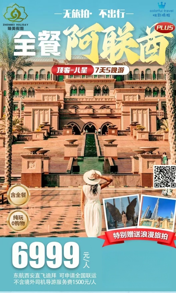 第1天 全国 ✈ 西安 ✈ 迪拜 - 沙迦用餐:早餐()- 午餐()- 晚餐() 住宿:阿联酋 四星酒店 12:00 咸阳国际机场 T5 航站楼集合,准备开启我们美好的行程。15:00 搭乘中国东方航空公司 MU705 班机飞往迪拜20:45 抵达迪拜,前往指定的地点排队照眼睛,入境(大约 1-2 小时),举牌接机,前往沙迦入住酒店休息。联运航班时间待定,以航司批复为准;航空公司规定:联程航班必须按照顺序使用,首段航班未乘坐,后续航班全部作废!   第2天 沙迦 - 阿布扎比用餐:早餐()- 午餐()- 晚餐() 住宿:阿联酋 四星酒店 酒店内享用早餐后,前往参观【沙迦之心(Heart of Sharjah)】,是阿拉伯重要的历史文化遗产腹地,也是沙迦文明的起源地。它集文化风俗、建筑艺术和古老遗迹为一体,再现了沙迦的辉煌历史。参观【沙迦艺术博物馆】(入内 40 分钟),这里是中东海湾地区规模最大的艺术博物馆。原汁原味的伊斯兰美学建筑,展示 500 余件出自阿拉伯及国际知名和新兴艺术家手笔的绘画和雕塑,甚至还有沙迦酋长殿下的私人珍藏,捍卫了从历史经典到现在流行的阿拉伯艺术瑰宝。【行程说明:此地为有深度的抽象艺术展览和艺术交流地,不允许馆内高声喧哗,团队不配备专业的馆内讲解员,导游车上讲解该馆的大概情况后入馆自由参观品鉴】。 前往【伊斯兰文明博物馆】(入内约 40 分钟,如遇周五或节假日闭馆,改为外观,无退费),是阿联酋首家伊斯兰文化博物馆,坐落于沙迦市区西部。馆内展室分为上下两层,来自伊斯兰国家的 5000 余件精美艺术品可让游客对伊斯兰世界有较为系统的了解。【行程说明:此地为虔诚的宗教文化场所,不允许馆内高声喧哗,团队不配备专业的馆内讲解员,导游车上讲解该馆的大概情况后入馆自由参观】。 前往【火车头黄金市场】自由游览(如遇关闭,变更其他景点)。 驱车进入最小的酋长国“阿之曼”,在著名的【阿之曼海滨】(停留约 30 分钟)由于这里没有其他的城市设施,所以海滩至今仍保留着原始的海滨风貌;岸滩宽广平坦,沙质纯净绵软,环境恬寂幽静,海天风光无限!美丽的阿之曼海滨一直延伸到沙迦。 前往阿布扎比—阿联酋第一大酋长国 途径【国会大厦】(车览)【文化广场】(车览)【酋长皇宫】(车览)了解阿联发展的历史。 前往【Heritage Village 民俗村】(约 30 分钟)在海滨大道上,可远眺对岸的海景与美丽沙滩;在漫长的海岸线-白沙、阳光,使您仿如置身于夏威夷。 途径【WAHAT AL KARAMA 纪念碑】(车览),占地 4.6 万平方米,是一座致敬为国捐躯的阿联酋烈士们的永恒纪念碑,以怀念阿拉伯联合酋长国自 1971 年以来的英雄士兵、警察、外交官及平民。【阿提哈德塔酒店】(车览)速度与激情拍摄地;【阿布扎比总统府】(车览)-一座全新打造的文化地标“国家宫殿”(Qasr Al Watan),总统府是当今阿联酋内阁和阿联酋最高权力机构联邦最高委员会的官方会议场所,也是正式国事访问和各国首脑活动的举办地。随着它向公众开放,参观者将有机会对阿联酋的政权制度和价值理念进行深入的了解,探究保存完好的文化传统遗。 行程结束后,前往酒店入住休息。温馨提示:1.同团有其他客人入住不同星级酒店,根据行程顺路原则安排每日接送,请提前知晓,谢谢理解!2.如阿布扎比/迪拜遇展会或其他情况酒店满房,则此日改为入住迪拜或沙迦同级酒店,敬请谅解!   第3天 阿布扎比用餐:早餐()- 午餐()- 晚餐() 住宿:阿联酋 四星酒店 酒店内享用酒店自助早餐,前往参观【谢赫扎耶德清真寺】(入内参观约 30 分钟,不含主殿入内),阿布扎比最大清真寺【着装要求:谢赫扎伊德清真寺入内参观时男士需穿着有领衬衫及长裤,女士不能穿露肩的上衣及短裙,请客人提前准备合格服装,以免到时不能入内参观 ,此景点为免费开放;】行程说明:清真寺停留时间以抵达和离开停车场为准,清真寺景区目前包含清真寺自带商业餐饮区、地下通道及通道内临时展览、清真寺,故停留时间是涵盖整个大的清真寺区域包含客人换装和安检时间,请提前知晓! 之后乘车前往萨迪亚特岛【阿布扎比卢浮宫博物馆】(入内参观 40 分钟),您可以在穹顶下的步道上漫步并俯瞰大海。直径 180 米的巨大穹顶由近 8000 个独特的金属星星构成,这些星星组成复杂的几何图形。当阳光透过穹顶射下来时,穹顶下会呈现出富有动感的光之雨,令人联想起阿联酋绿洲上婆娑重叠的棕榈树。在这里光影与文化艺术珍品的穿梭下,它可以令人们了解到相应的国家、历史和地理环境,但又不只是平庸地诠释了人类文化发展的进程   第4天 阿布扎比 - 迪拜用餐:早餐()- 午餐()- 晚餐() 住宿:迪拜国 际五星 派拉蒙 或同级 酒店内享用酒店自助早餐,返回迪拜(车程约 2 小时) 途中前往参观【迪拜世博园科技馆】(入内参观约 40 分钟)作为迪拜世博城的核心亮点之一,迪拜世博园科技馆以“科技赋能未来”为主题,将尖端科技、可持续理念与文化创新完美融合,科技馆内设有多个沉浸式展区,可通过 AI、VR、5G 等技术亲身体验未来生活场景,为您打造了一场跨越时空的奇幻体验,深入探索阿联酋的历史过去与未来 前往迪拜古城区【水上的士 ARBA】(单程约 5 分钟),搭乘传统工具,体验古时候早期的阿拉伯人往返迪拜运河两岸的场景。 随后前往【AL SEEF 阿拉伯历史文化街区】和【Bastakiya Quarte 阿拉伯历史建筑群】(游览共约 1.5 小时),这条滨河历史文化街区坐落在迪拜湾,沿河岸