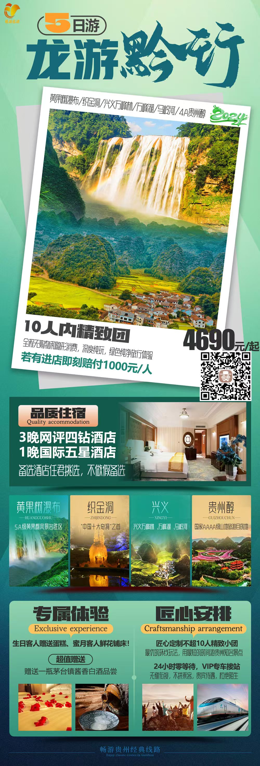 跟团游费用包含 1.用车:别克、大众威然、奔驰商务、宇通等同级用车(一人一座,根据实际人数安排用车) 2.住宿:全程入住三晚携程4钻+升级一晚国五酒店双人标准间(贵州无加床,无三人间) 参考酒店: 贵阳:维也纳(西南商贸城店)、云鹭酒店、凯里亚德酒店或同级 兴义:洛克时光、凤凰大酒店、海钰大酒店或同级 安顺:豪生温泉、澳潍、百灵希尔顿、黔工圣丰或同级 (备注:旺季贵州住房资源紧张,如遇特殊原因导致不能安排备选酒店时,我社有权安排同级别、同标准的其他酒店) 4.交通:福建贵阳往返机票经济舱(出票后不能退票,不能更改、不能取消)。 3.用餐:全程4早(酒店早餐,不用不退),全程不含正餐,需客人自理。 5.门票:所列景点首道大门票 6.导游:此线路全程为师傅兼向导(师傅兼向导的景区大部分需要客人自行游玩,师傅帮办理相关手续后在景区门口等客人,不跟着一起走,带来不便还请见谅);如需安排导游加400元/天导服费用! 7.保险:旅行社责任险 费用不含 1.自由活动期间交通费和餐费 2.全程入住酒店产生的单房差及加床费用 3.因旅游者违约、自身过错、自身疾病等自身原因导致的人身财产损失而额外支付的费用 4.因交通延误、取消等意外事件或不可抗力原因导致的额外费用 5.儿童报价以外产生的其他费用需游客自理 6.旅游意外保险及航空保险(建议旅游者购买) 7.不占床位游客不含早餐 【非必须消费】马岭河观光电梯单程30元/人、往返40元/人;属自愿消费项目。 购物安排 纯玩 儿童安排 包含:(2-12岁)只含车位、服务费、正餐半餐、机票 不含:酒店早餐、床位、门票、观光车、电瓶车、索道、游船费等。赠送项目如产生请按实际收费自理。景区内另行付费景点或娱乐项目,请根据喜好自愿选择。 退票说明及优惠政策 本行程中所有景点门票已经是旅行社优惠结算价,持有特殊证件(教师证、学生证、老人证、军官证)等证件的游客,产生的优惠不再二次优惠,不退费,请悉知! 备注:此线路全程为师傅兼向导(师傅兼向导的景区大部分需要客人自行游玩,师傅帮办理相关手续后在景区门口等客人,不跟着一起走,带来不便还请见谅);如需安排导游加400元/天导服费用! 发班周期:天天发班 单房差:500元(1月26日-2月4日期间房差780元) 收客限制:港澳台地区、境外人士等以上区域现询!