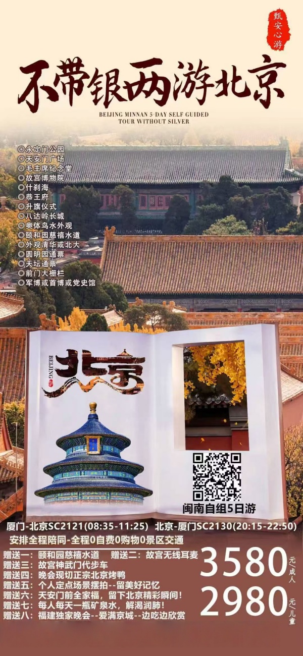 零购物零自费费用包含: 酒 店:全程入住市区4环附近连锁/商务快捷酒店 (每人一个床位,如果产生了单男单女,客人须补足单房400元/人/4晚) 连锁参考酒店:忘归、市长之家、汇睿天城、汉庭连锁、格林豪泰、速8、如家、海友、尚客优、锦江之星或其他同级酒店 温馨提示:依环保部门要求,自2020年5月1日,酒店将不再主动提供一次性日用品(牙膏、牙刷、梳子、浴巾等),如您有需要可详询前台,酒店房间进行全方位,无死角的严格消毒处理,让游客安心放心。 用 餐::全程含4早8正餐,正餐餐标30元/人!升级一餐“爱满京城晚会”晚宴(如用餐人数不足十人,餐厅根据用餐人数及餐费标准安排的菜品酌情减少,早餐一般为房费含早,不用早餐不予退还) 门 票:行程所列景点首道门票; 导 服:优秀导游讲解服务; 交 通: 1.厦门-北京往返机票;往返机票(含税)机票团队票一经开出,不得签转或退票,如遇航空公司临时调价有权调整价格 2.北京全程正规空调旅游车 不含项目:客人自行产生的费用,以及不可抗拒的因素产生的费用如航班取消或者延误产生的餐费住宿费以及重新购买交通工具所产生的费用等。 儿童标准:儿童指年龄2-12周岁以下,含正餐早餐车位导服机票门票,不占床。 购物安排:全程0购物店安排 自费项目:全程不推自费项目,不推景区交通