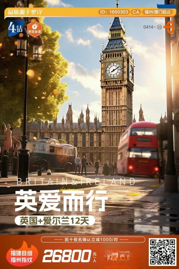 跟团游费用包含: 1.机票:福州/厦门往返目的地经济舱团体机票、机场税及燃油附加费,开票后不能退改签; 2.住宿:行程中参考酒店(如遇展会/旺季/当地节假日或其他不抗力导致酒店无房,将调整至不低于原评分的同级酒店),以两人一房为标准、酒店欧陆式早餐; 3.用餐:行程中标注所含早餐10顿和正餐13顿(含1顿特色餐:炸鱼薯条),正餐为精选中式6菜1汤(8-10人一桌,或根据餐厅提供桌型安排就餐座位),无法安排中餐的地方将安排当地餐或退餐费(10英镑或者12欧元/人/餐),所有餐食如自动放弃,款项恕不退还;如果在全团协议下同意改为风味餐,不退正常团餐费用; 4.用车:境外旅游大巴、专业外籍司机; 5.门票:莫赫悬崖、巨人堤、大英博物馆讲解;详细参照附带行程中所列之景点(其他为免费对外开放或外观景点或另付费项目); 6.签证:英签签证费用; 7.保险:境外30万人民币医疗险(70周岁以下); 8.wifi设备:移动WIFI产品每台设备可供4人使用(以手机为佳,若连接其他设备可能会影响使用速度,个别国家或区域无法提供,敬请谅解); 9.已含全程司导服务费元。 费用不包含:1.70岁以上(含70岁)老年人特殊保险费用(请视自身情况购买,并请签署健康承诺函及亲属知晓其参团旅行的同意书); 2.单房差:酒店单人房附加费5500元/间。 注:酒店单房差仅指普通单人间(如团友要求大床单间或单独一人住标双,单房差另议); **分房以团友报名的先后顺序安排拼房,若团友不接受此种方式或经协调最终不能安排,或出现单男单女且团中无同性别团员同住的情况,需在出发前补单房差入住单人房; 3.行程表费用包含项目以外或未提及活动项目所需的费用,例如行程不含的特殊门票、特殊交通、酒店内的私人消费等费用。